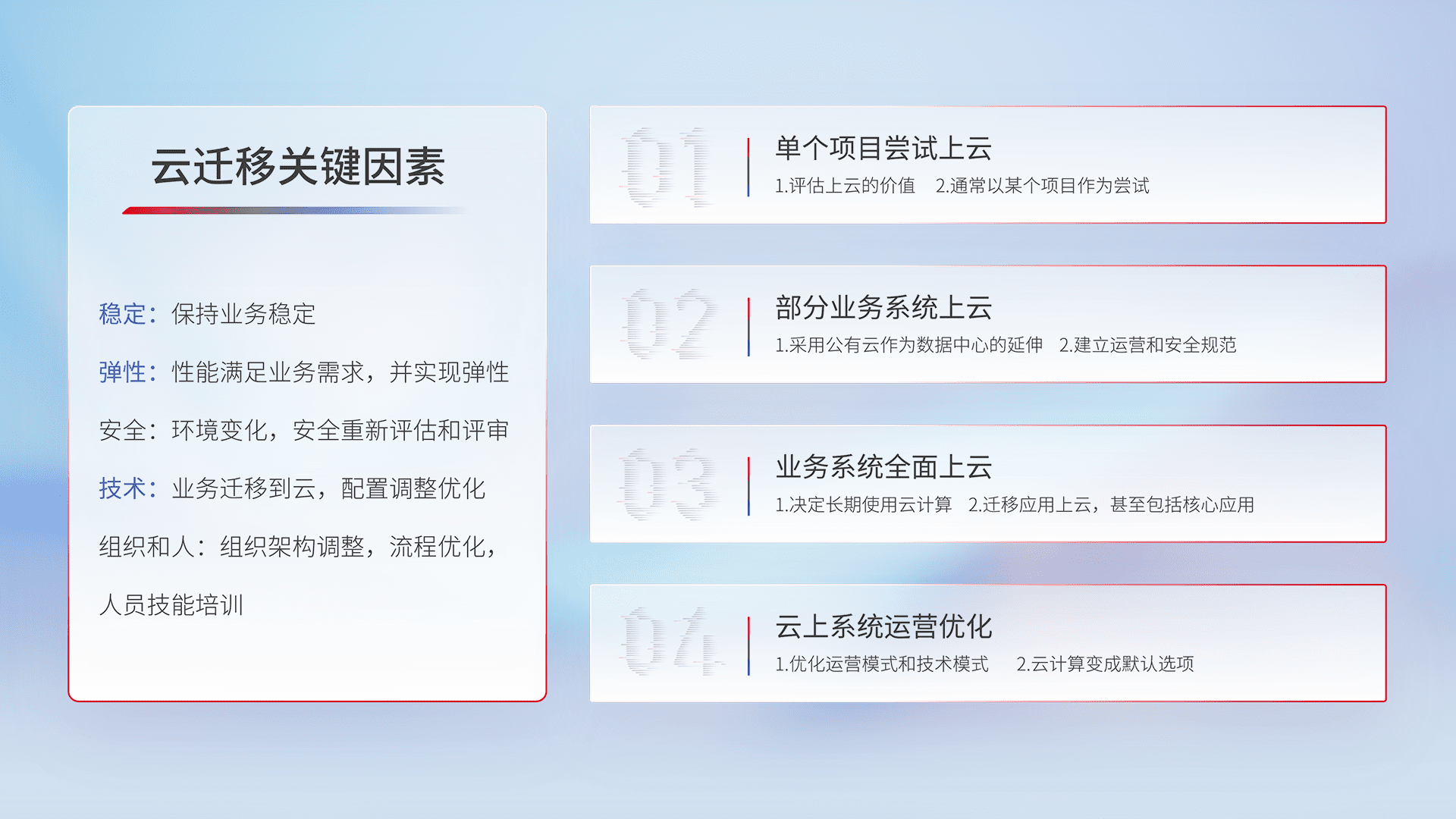 结合实际业务,,,,从规划设计、、、、云平台选型、、云原生改造、、数据迁移、、、、集成交付,,,迁移全过程为客户识别最佳上云路径,,,,做好风险识别管理,,,,设计网络架构、、、、身份权限、、、、安全审计合规、、、操作审计、、日志审计、、、、监控告警策略、、、多站点容灾设计等,,,,对云上基础设施进行整体规划,,,,提升IT治理水平,,,以满足弹性、、、高可用、、高性能的需求。。。。
