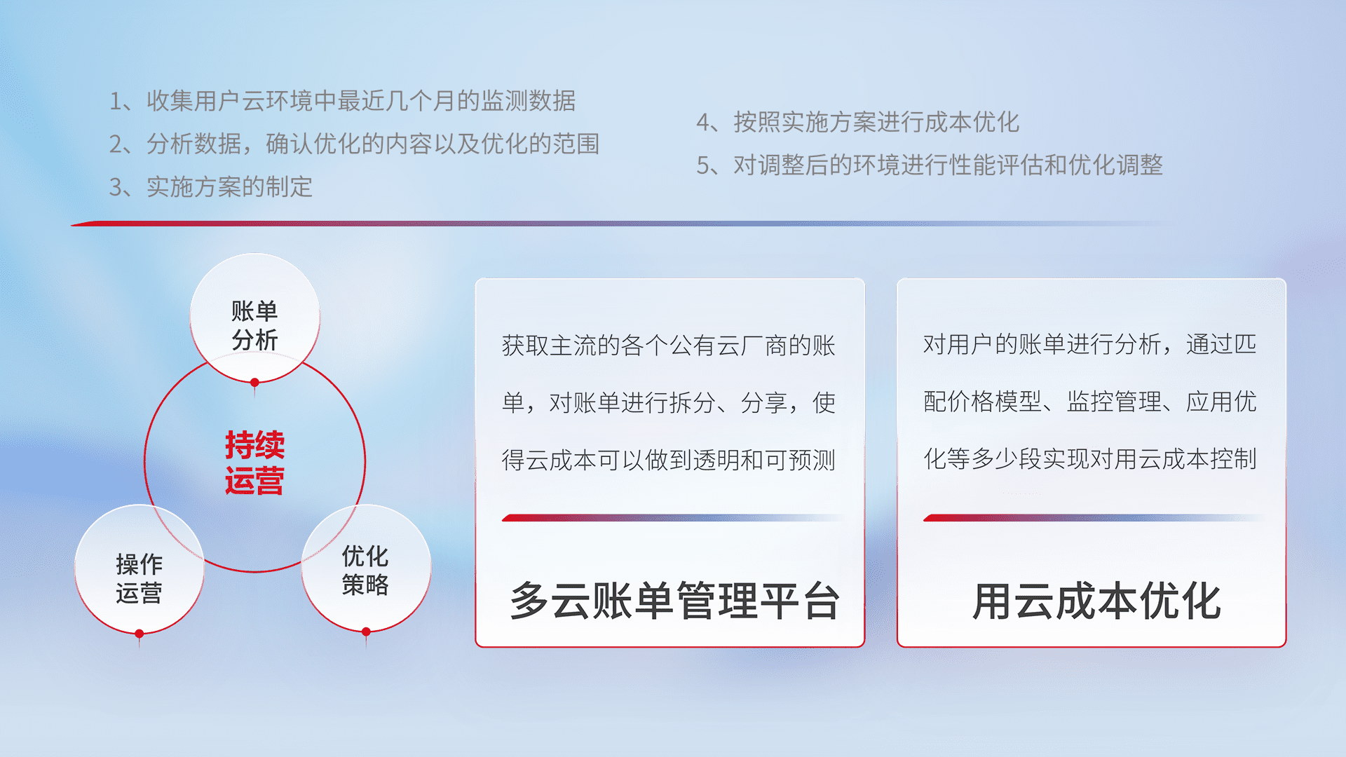 通过多云纳管,,,,以统一的资源数据模型把客户的云资源进行抽象和封装,,,进而实现对多云资源的统一操作,,,保障云资源管理的可靠性、、、稳定性与可用性。。。量身定制化运维内容,,配置、、开发运维、、、、补丁管理、、、、备份、、监控、、、、认证和访问管理、、、审计和日常巡检等,,保障在用云过程中的可靠度,,,稳定度以及高可用率。。